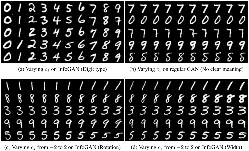 在GAN中,生成器是如何使用噪声的,这点不明确、不可解释。噪声各维度和样本的语义特征是怎样对应的,也不清楚。但是很多问题都可以分解成可解释的语义特征。例如MNIST数据集可以分解成数字、笔画粗细、数字倾斜程度等等。
