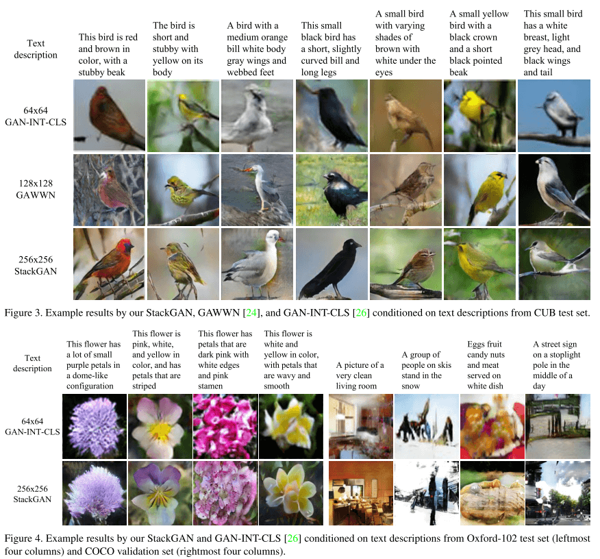 LAPGAN、GAN-CLS-INT和StackGAN显示,先粗后精的生成思路确实达到了不错的效果,这种思路或许是接下来图像生成研究的热门方向。